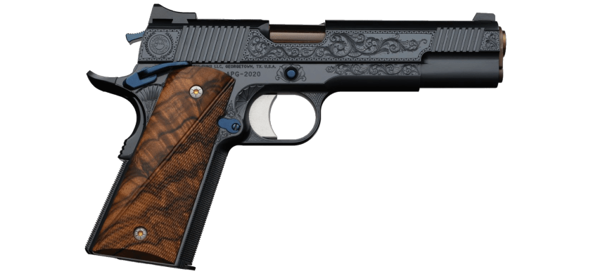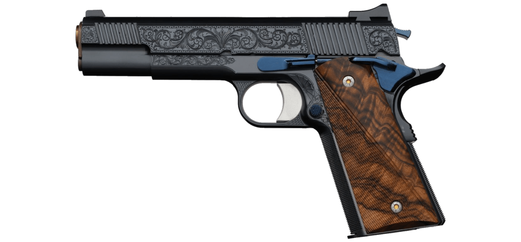 The intricate details and master craftsmanship of this one-of-a-kind pistol reflect the pinnacle of what the American Pistolsmiths Guild can accomplish. The pistol integrates the best of artistry and functionality, making it a true embodiment of America’s favorite sidearm. The aesthetic brilliance of the pistol includes open scroll engraving within zigzag outlined panels and the guild seal at the rear, all hand cut by Brian Powley. The same open floral scroll embellishes the frame, complemented by a fan motif in the trigger guard dish, cross hatches on the bow, and a sunburst below the ambidextrous safety.