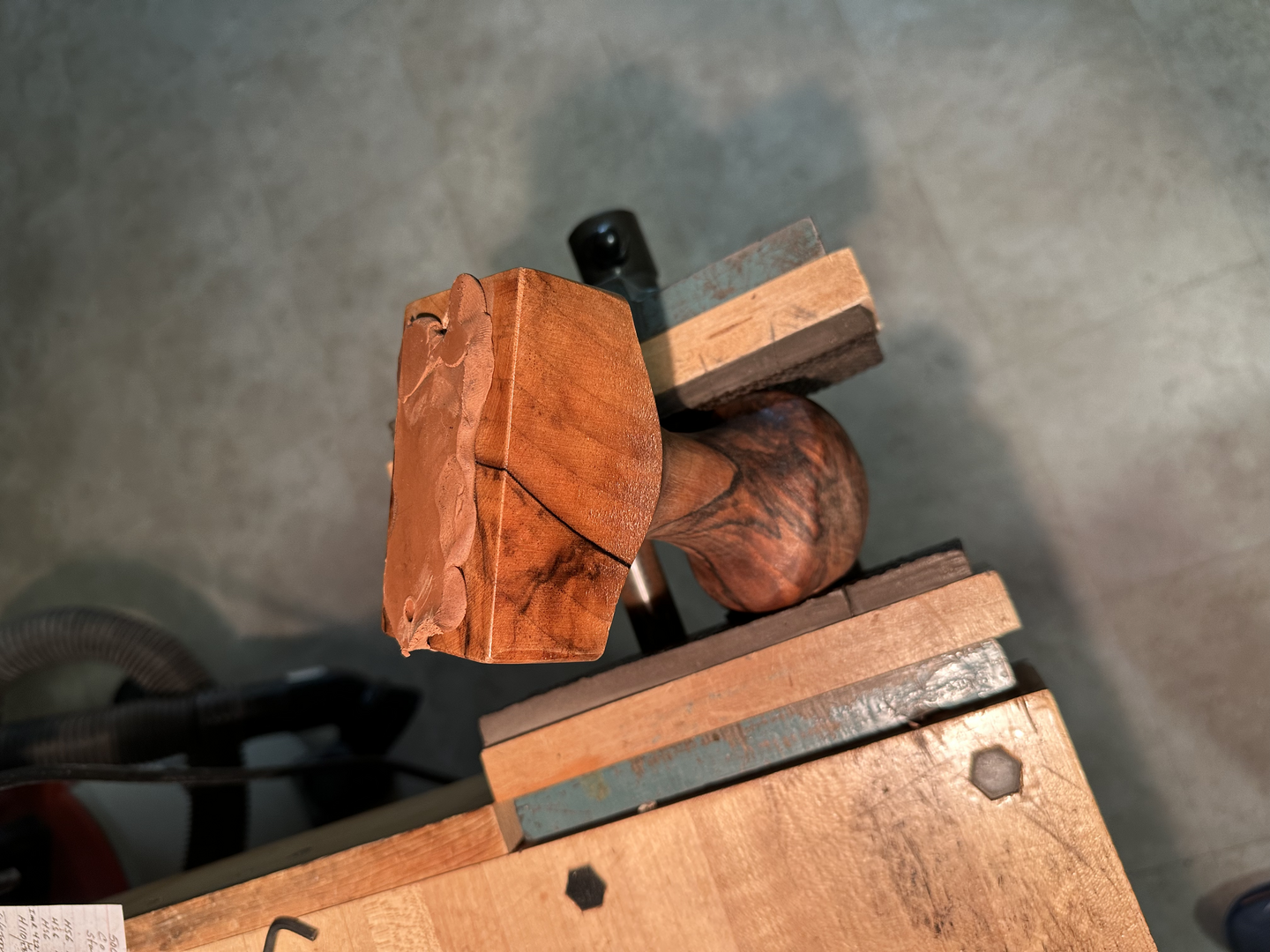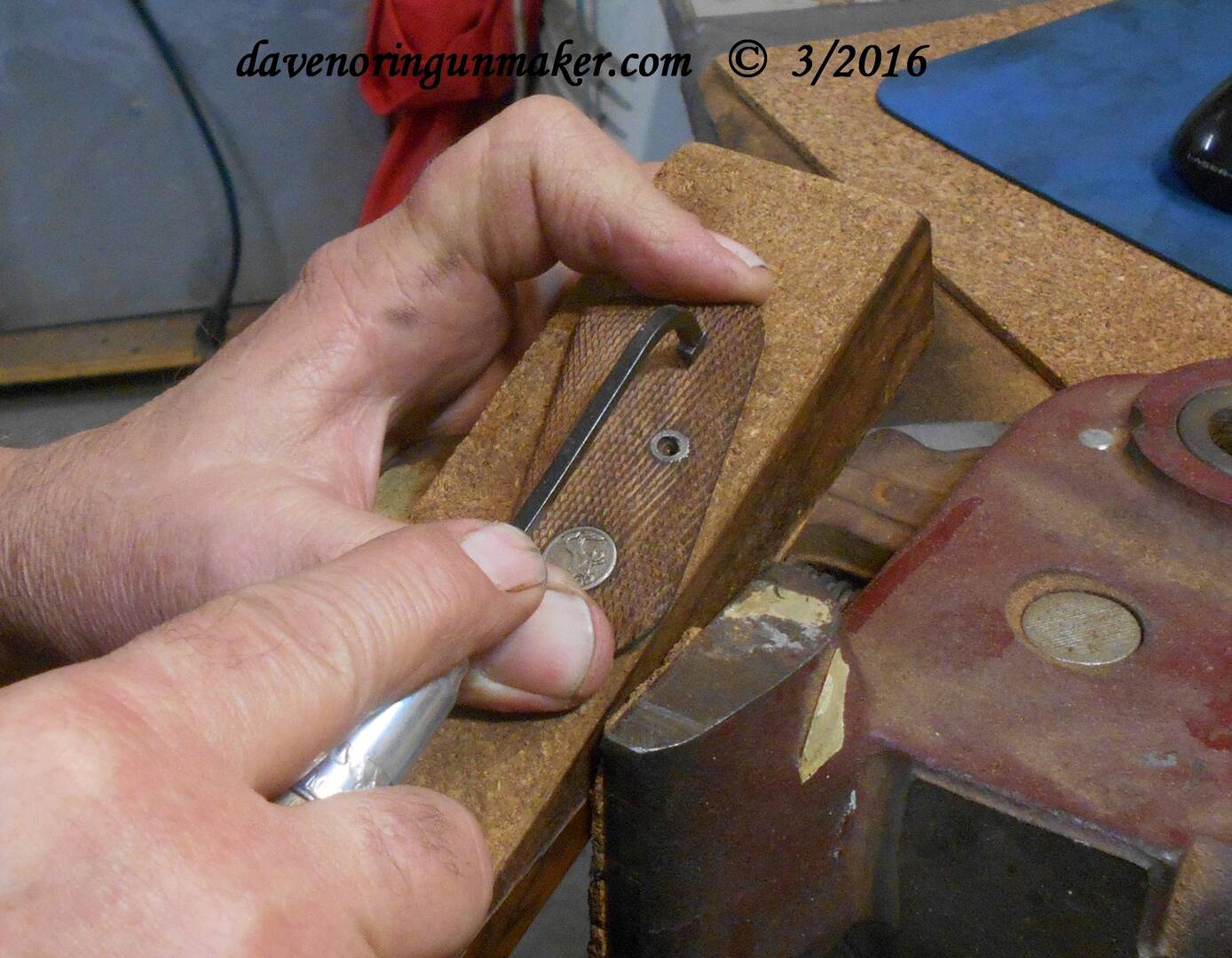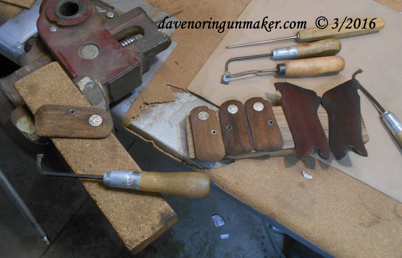 I made this block with a round ball at the base so it can be turned in almost any direction in a vise, and clamped solid for checkering. The brown clay looking putty at the top is actually a non hardening modeling clay made for kids and sold at Michaels and such stores. When the clay is lightly warmed the grip can be set on the clay and pressed down. When it cools after just a couple minutes it holds the panels solid yet they can be removed easily. both hands are free this way