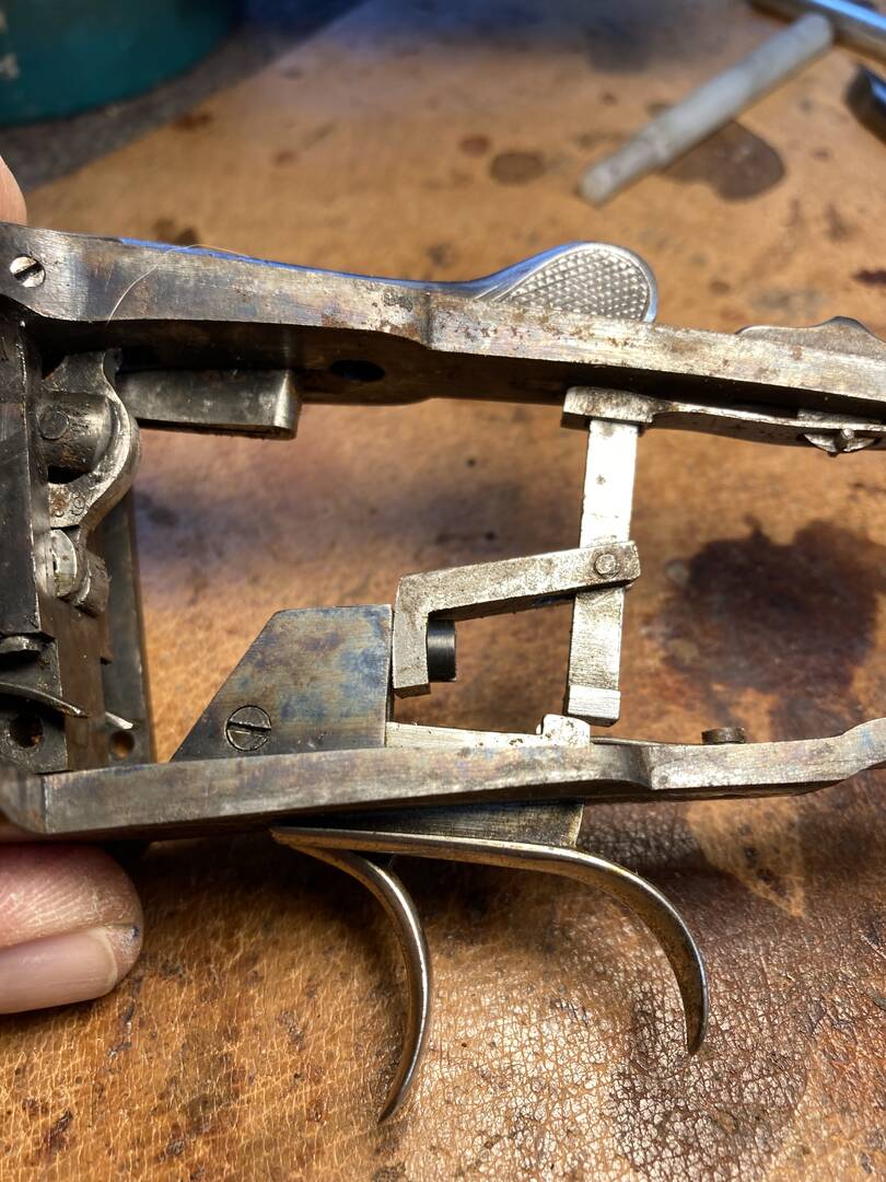 Discovered on a Parker I got in for repair of the replacement buttstock. An interesting way to avoid inletting that pesky factory safety toggle: make a whole new linkage 🤔